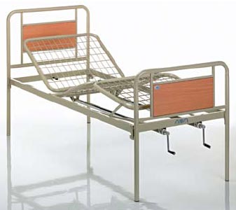 Медицинская кровать с головным и ножным подъемом. В изножье кровать оснащена двумя ручками с помощью, которых можно поднимать и опускать головной и ножной конец кровати. Рама с порошковой окраской.
