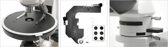 Круглый вращающийся предметный столик диаметром 175 мм с керамическим покрытием, с градуировкой 360° и шагом в 1°, нониусной линейкой до 0.1° и двумя зажимами для препарата. Дополнительные принадлежности включают: механический держатель и координатный препаратодержатель